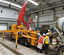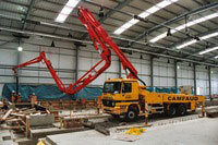 The pump chosen for this contract was a Putzmeister M31/5 concrete pump with a maximum theoretical output of 140 cubic metres per hour. This pump was chosen, not so much for its high output but for the boom configuration. The M31/5 boom combines a long reach with a low unfolding height ensuring the concrete can placed in relatively low height buildings with the minimum number of set-up positions.