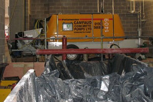 Progressive awarded the contract to pump the screed to Camfaud and so, as progressive prepared the floors for screeding, Camfaud installed a fixed pipeline that would eventually rise to approximately 175 metres high. The pump chosen for the job was a brand new, Putzmeister BSA1409D This pump had the output and pressure required to pump to this height and it complied with the most recent environmental and emissions regulations.The screeding was programmed to take place each Wednesday when the area around the pump was dedicated to deliveries of screed and the pumping operation. On non-pumping days, progressive prepped the next floors and Camfaud modified the pipeline accordingly.